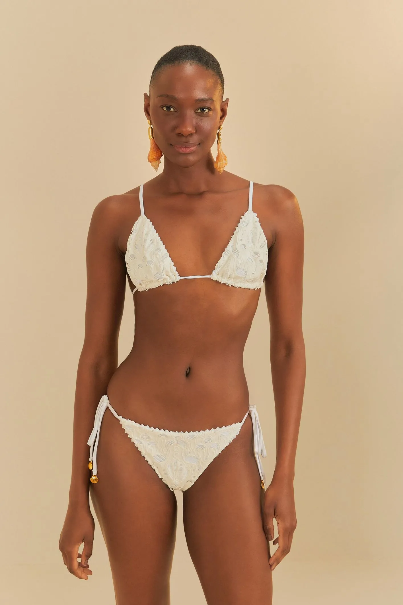 biquíni lacinho conchas. traz design clássico com top triangulo de alças finas ajustáveis, perfeito para momentos de lazer à beira-mar. a calcinha com laterais de amarração oferece charme e conforto, garantindo ajuste perfeito. os detalhes que fazem a diferença estão nos acabamentos cuidadosos, que elevam qualquer produção de praia.