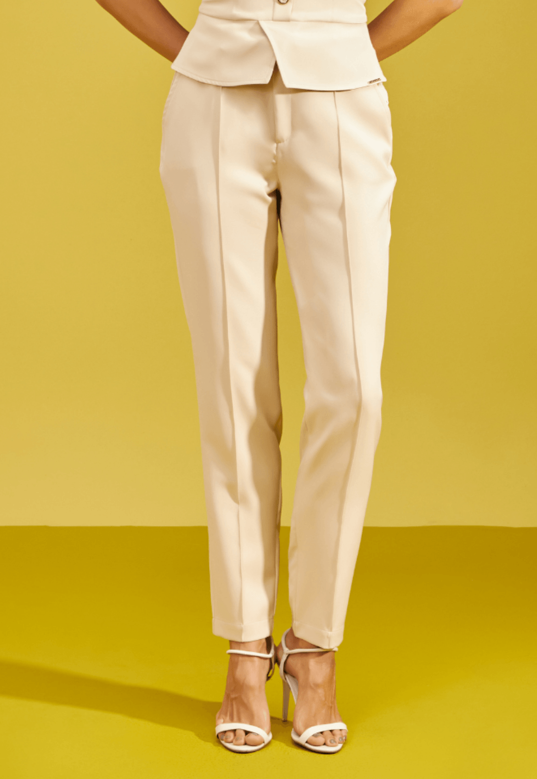 Em tom bege sofisticado, essa calça de alfaiataria é a peça-chave para composições refinadas. As nervuras frontais trazem um toque de alfaiataria tradicional, enquanto o cinto fino com fivela adiciona um detalhe sutil e moderno ao visual. A modelagem ajustada valoriza a silhueta com elegância e conforto.