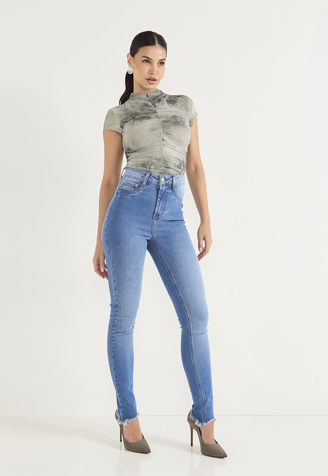 Calça Jeans Denim Zero Skinny Alta possui comprimento entrepernas modelo tradicional, com 78 cm. Sua lavação é tradicional com marmorizado e a barra desfiada. Seus bolsos costas são funcionais e bolsos dianteiros falsos com bolsinho relógio decorativo. Os aviamentos são exclusivos e personalizados da marca.
